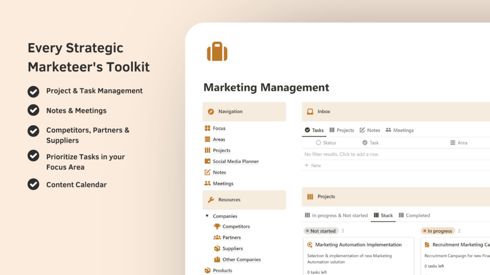 Unleash the power of effective marketing management with our ultimate Marketing Management Notion template. Packed with features designed for marketeers, this template is your key to streamlined project management, task tracking, competitor analysis, and social media planning – all in one centralized workspace.